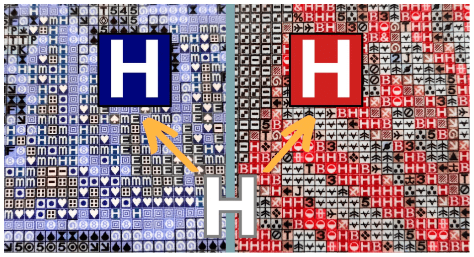 В примера по-долу сме използвали символа “H”. Той присъства и в двете картини – в едната е син, а в другата е червен.
